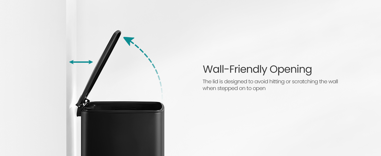 Halkan záródik és nyitva marad】 A pedálos szemetes fedele lassan és csendesen záródik, megakadályozva a csapódást. 90°-os szögben felnyitva nyitva is maradhat, így könnyebb a hulladék elhelyezése hosszabb feladatok közben.