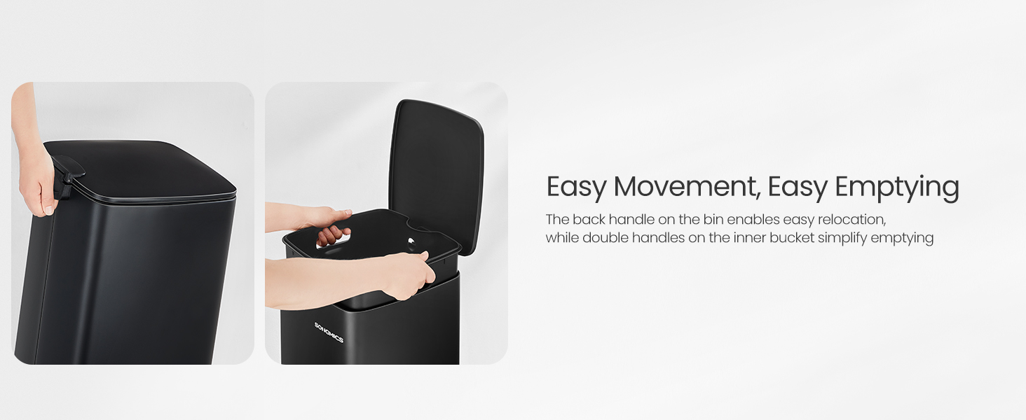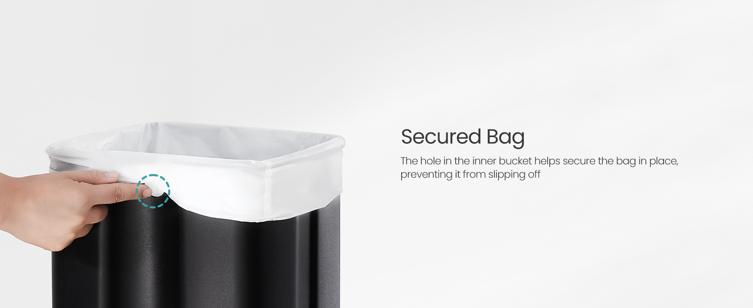 - Praktikus belső vödör】 A kivehető belső vödör megkönnyíti a hulladék eltávolítását. Oldalsó fogantyúkkal van ellátva a könnyebb kiemeléshez, valamint rögzítőnyílással, amely megkönnyíti a szemeteszsák cseréjét és a helyén tartását.